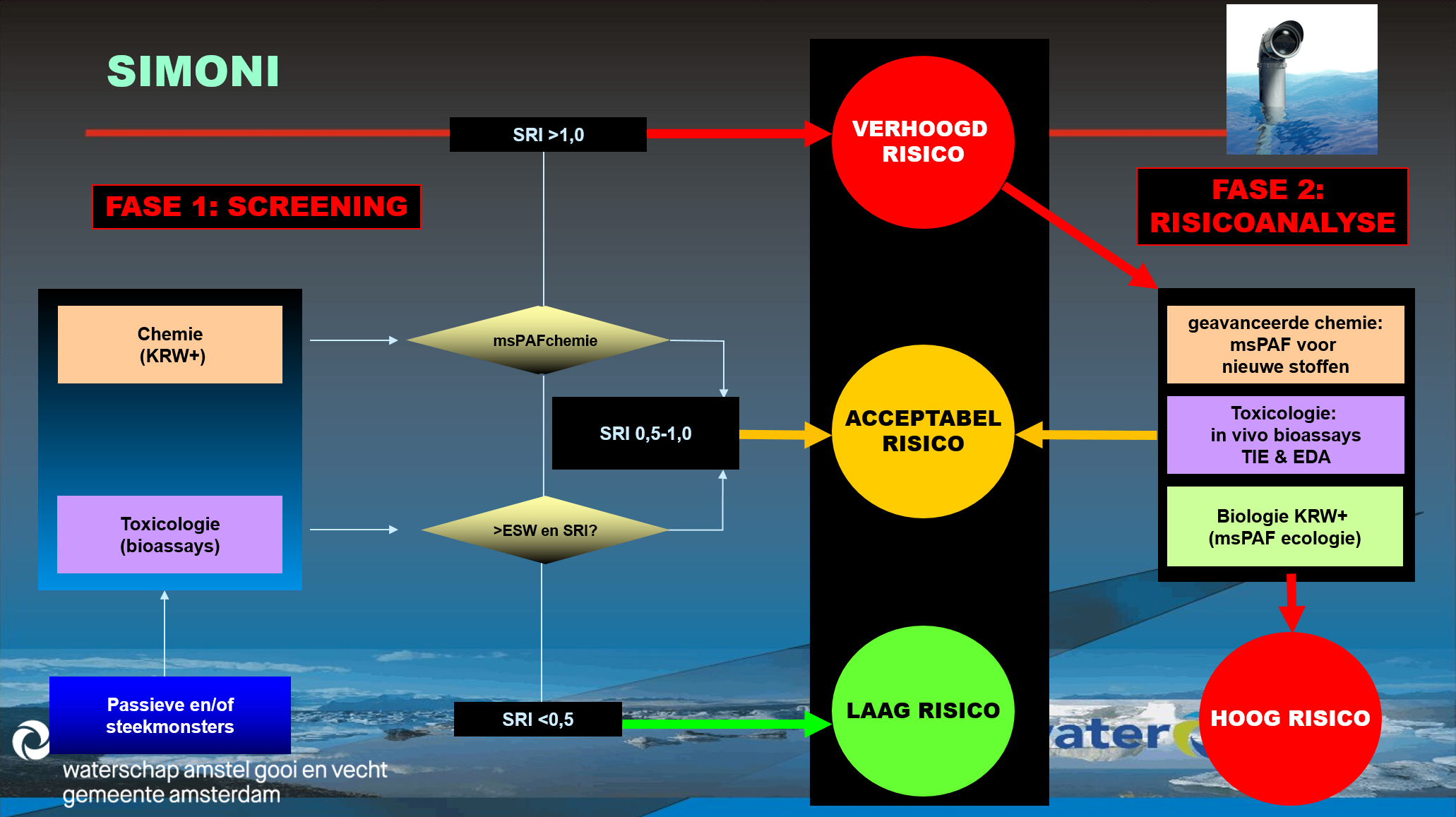 Omdat een lichte overschrijding van één ESW nog geen gevaar voor de ecologie hoeft te betekenen is een model ontwikkeld om een indicatie voor het milieurisico te geven op basis van alle bioassay-resultaten, de SIMONI Risico Indicatie (SRI). De SRI wordt bepaald door een gewogen gemiddelde te nemen van alle bioassay-resultaten in de fase 1-screening. Het model is geijkt op basis van veldvalidatie in het beheergebied van Waternet, zodat een SRI >1 indicatief is voor een verhoogd milieurisico door microverontreinigingen. Als de SRI tussen 0,5 en 1,0 ligt is er al invloed van microverontreinigingen meetbaar, maar is het milieurisico nog aanvaardbaar. Een SRI <0,5 wordt gezien als een laag milieurisico. Omdat uit de resultaten van bioassays niet naar voren komt welke stoffen de effecten veroorzaken, wordt op de locaties met de hoogste SRI in fase 2 (risicoanalyse) een nader chemisch-toxicologisch onderzoek uitgevoerd. Het schema van de SIMONI-strategie is weergegeven in de volgende figuur.